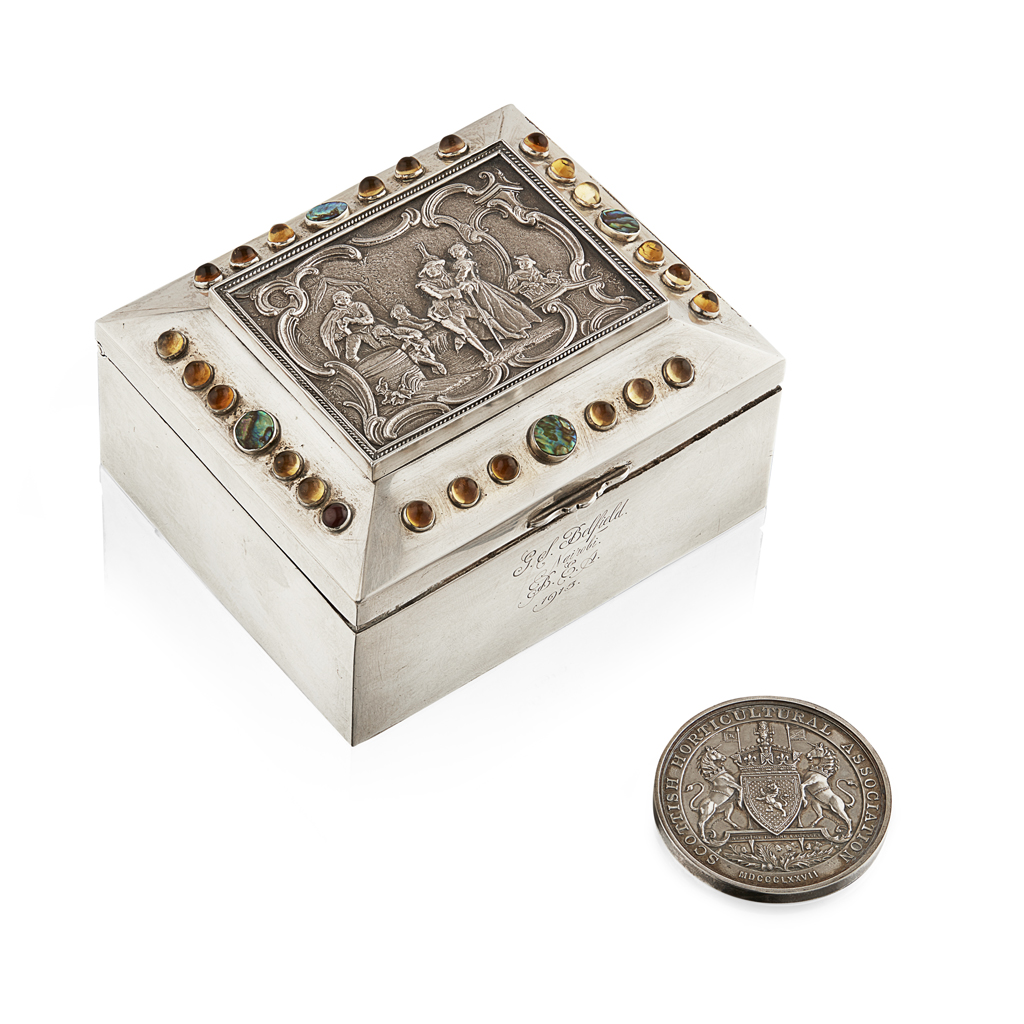 George S Belfield, Edinburgh 1911, of rectangular outline, the hinged lid with an embossed scene of dancers in an interior, surrounded by an outer border decorated by collet set hardstone and shell cabochons, the box engraved with the maker's signature G.S. Belfield, Nairobi, 1915, accompanied by a cased silver Scottish Horticultural Medal awarded to the Belfield for dinner table decoration, 1894 (2)