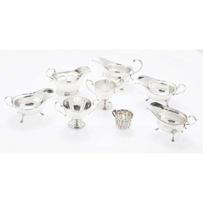 to include a sauceboat, Haseler Brothers, Chester 1904, retailed by Sorley Glasgow together with, two sauceboats both Sheffield, two handled cup, two sauce boats, one milk jug, one teacup all Birmingham (8)