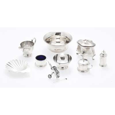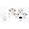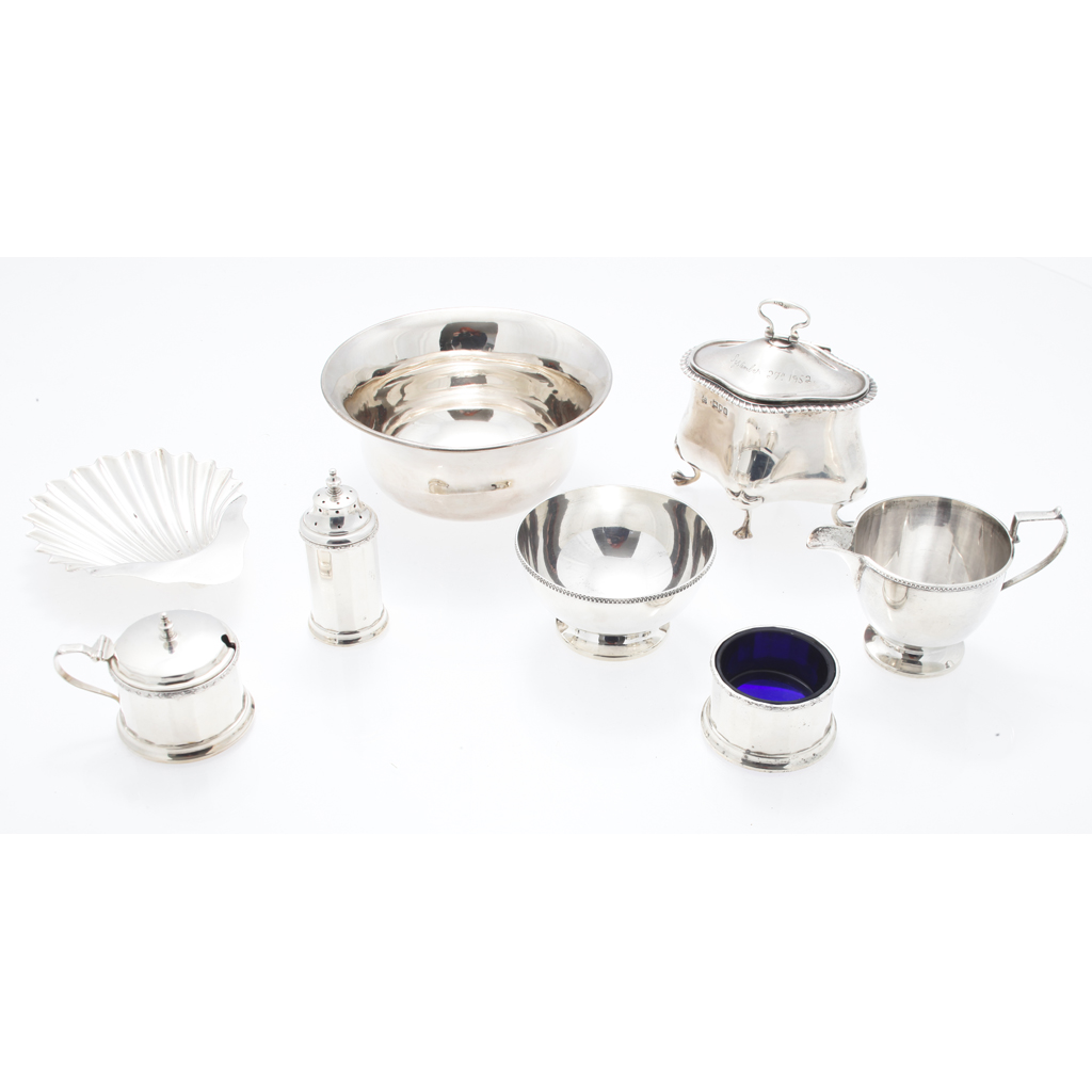 to include W & C Sissons, 1902, a hexagonal mustard pot with lid inscribed September 27th 1952, together with a shell butter dish, two bowls one plated, two condiments with blue glass insets, jug (qty)