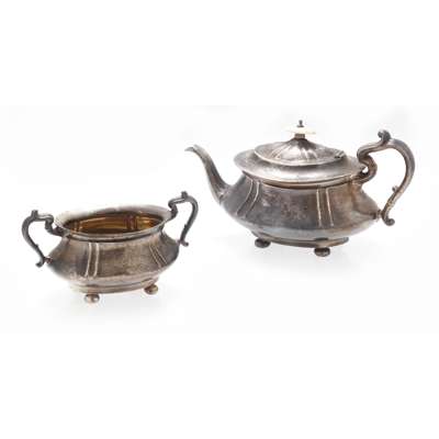 JC, Birmingham 1902, of oval form, panelled sides, moulded scrolling handle, curved spout, all on ball feet (2)
