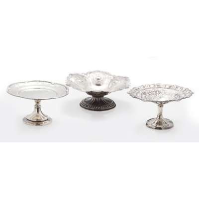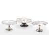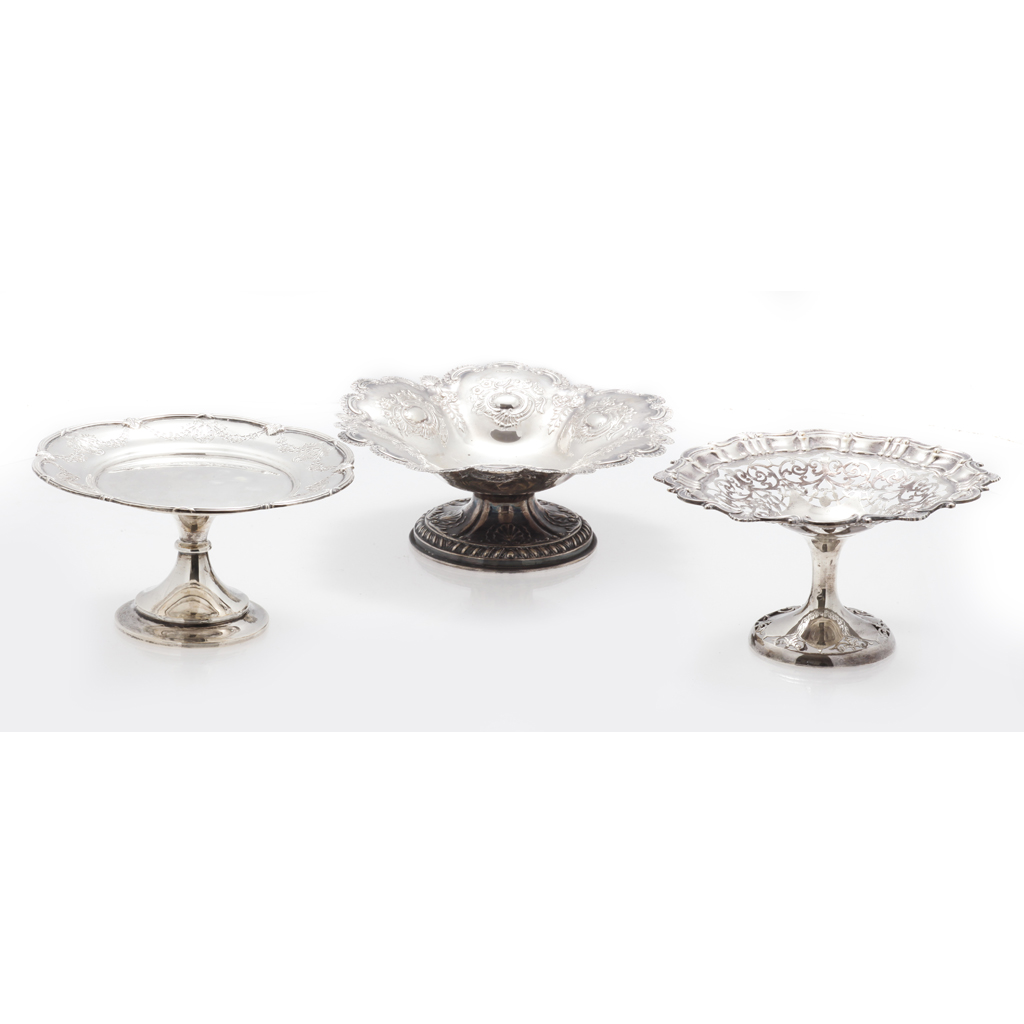Walker & Hall, Sheffield 1902, the shallow dish with pierced detailing, scalloped rim, raised on a trumpet stand with pierced detailing, together with another 1899 and a smaller, Goldsmiths & Silversmiths Co Ltd 1905 with pierced garland detailing (3)