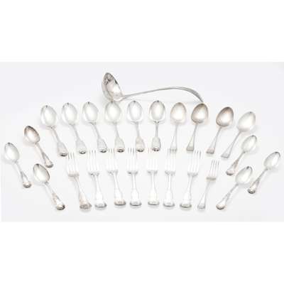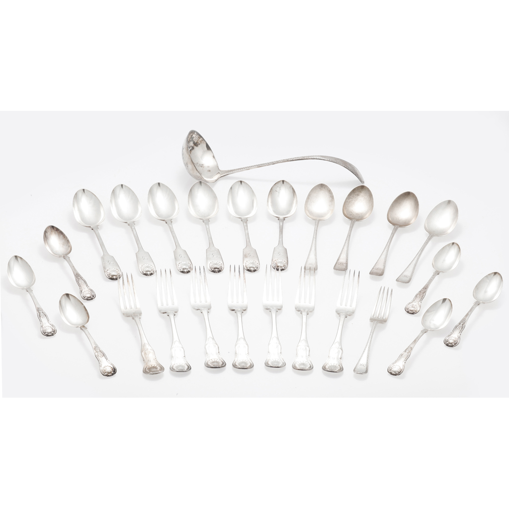 Sheffield 1898, and four ensuite table spoons of old English pattern feather edged detail, together with a part set of flatware, to include, David Crichton Rait, Glasgow 1844, seven table forks of single struck King's pattern, with twelve other pieces similar pattern (qty)