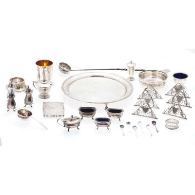 to include a Victorian small salver, London 1895, of circular form, beaded border, engraved flat and raised on claw feet; various condiments; place card holders of scrolling form; a porringer; a christening mug; Victorian card case; napkin rings; Georgian toddy ladle etc. (qty)