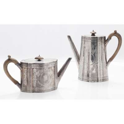 The Barnards, London 1874, of tapered form, slender spout, wooden scroll handle and finial; together with a matching teapot, London, 1875, both later inscribed; STPA to JMH, surrounded by elaborate garland and foliate engraving (2)