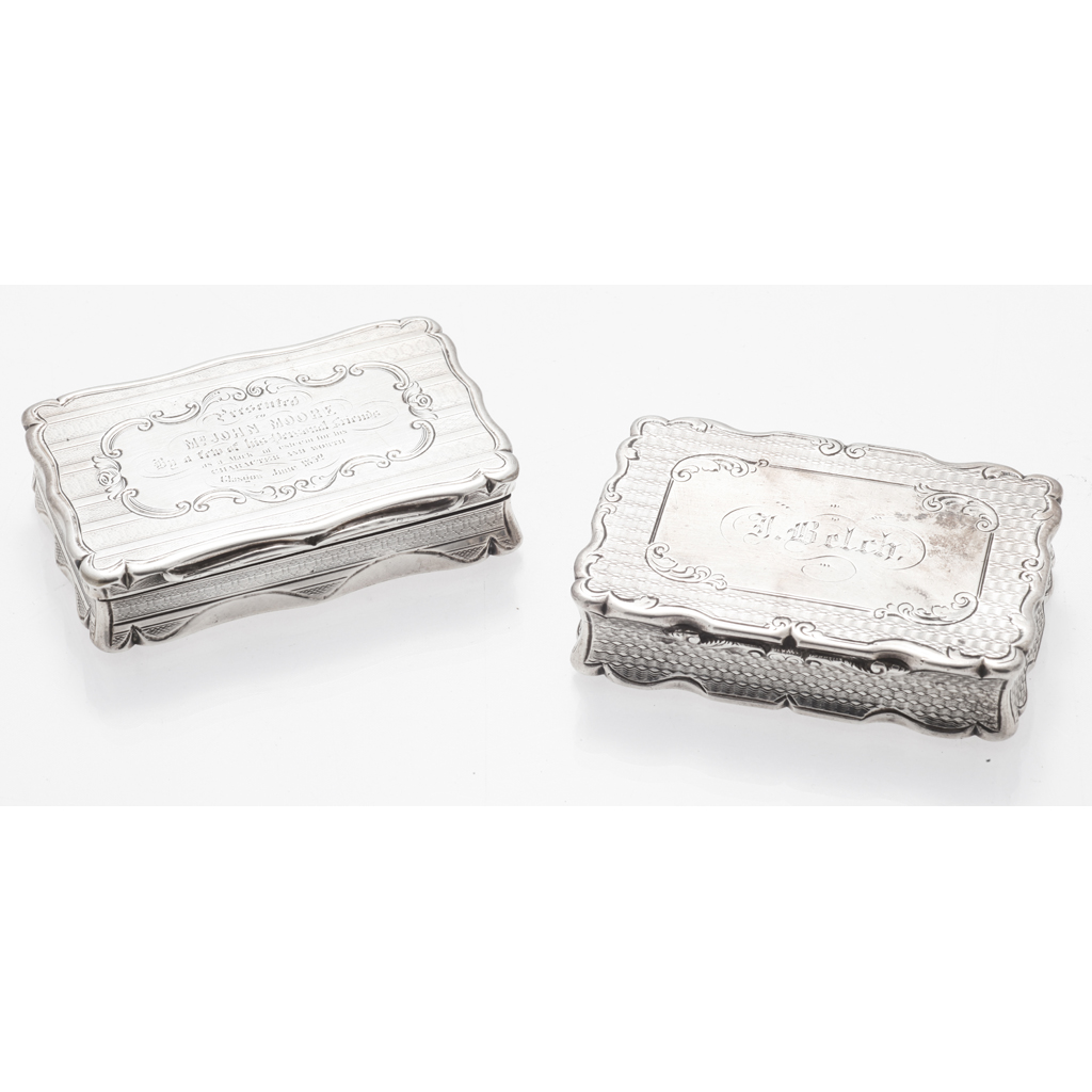 Frederick Marson, Birmingham 1854, scroll border with engine turned decoration, engraved J. Belch to the front, together with another snuff box, Edward Smith, Birmingham 1851, cross-stitch motif presented to Mr. John Moore (2)