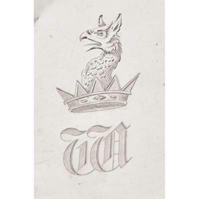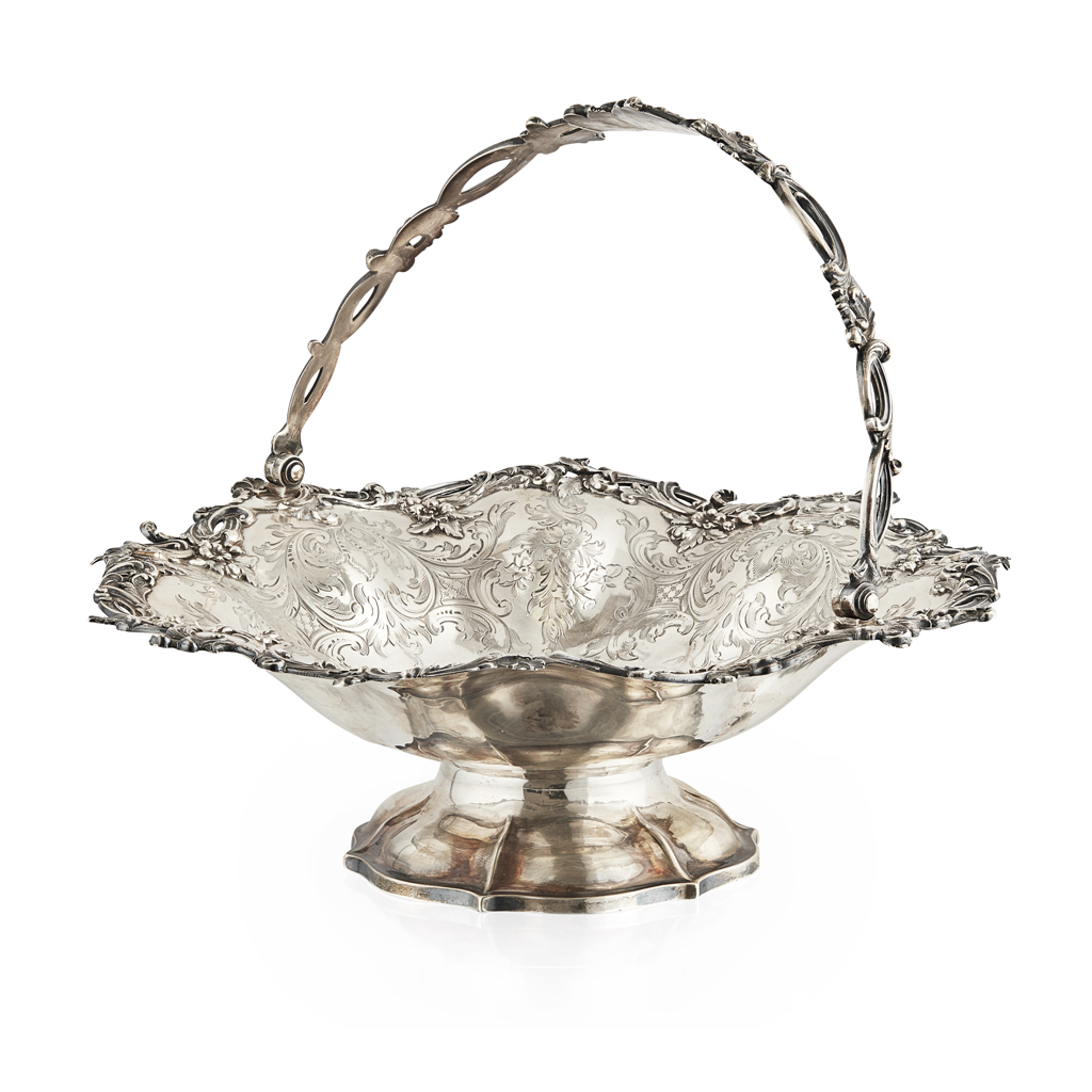 The Barnards, London 1846, of shaped circular outline, the shallow dish of lobed form with engraved trellis and foliate decoration, with a cast scroll border and with hinged swing handle, raised on a spreading lobed foot