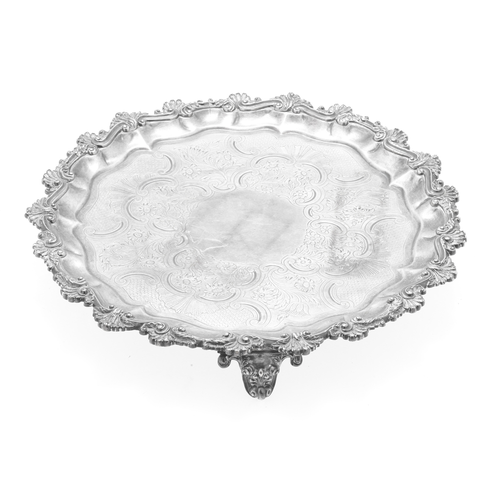 J Angell/I Angell, London 1833, of circular form, bold cast scroll decoration, chased flat with blank centre, all raised on three scrolling volute feet