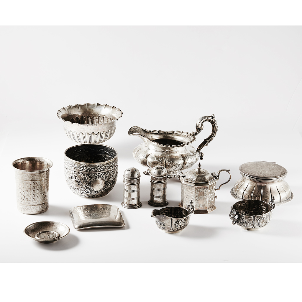 to include a Victorian octagonal mustard pot and cover frame, allover engraved; a miniature sugar and cream; a William IV cream jug, of squat from, ribbed body and engraved; a Victorian sugar bowl decorated in the Indian style; a pedestal sugar bowl; two pepper pots, cigarette case, inkwell