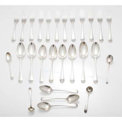 various dates and makers, mainly Old English pattern, engraved various crests, comprising; twelve dessert forks, eight dessert spoons, seven various spoons