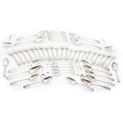 mixed dates, primarily late 18th and early 19th century, various makers, engraved various crests, comprising six table spoons, twelve table forks, nine teaspoons, ten dessert spoons and forks, two ladles and five condiment spoons
