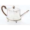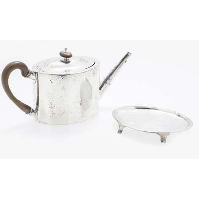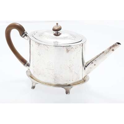 Charles Aldridge 1791, the plain body of navette form with straight spout and simple domed hinged cover, wooden handle, engraved crest to the front, together with an associated stand, John Emes, London 1800, of simple oval outline with reeded border, the centre with engraved trailing foliate decoration, raised on four simple bracket feet (2)