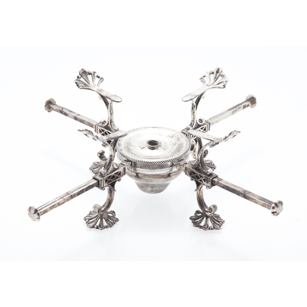 T.*, London 1773, of traditional form, central burner, engraved crest, four radiating arms, shell sliding terminals and matching feet