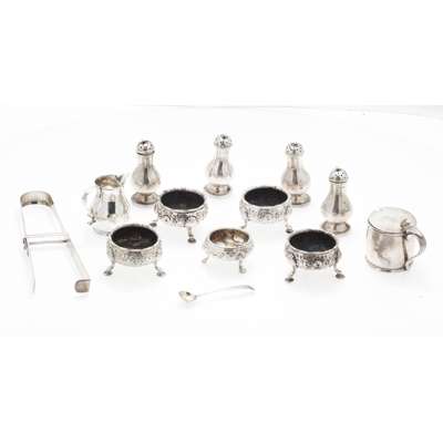 David Hennell I, London 1760, the bellied bowls with everted slightly scalloped gadrooned rim, embossed and chased floral garland raised on four lion mask paw feet together with four pepper pots, one jug, one pair of large tongs, tankard, spoon and one salt (qty)