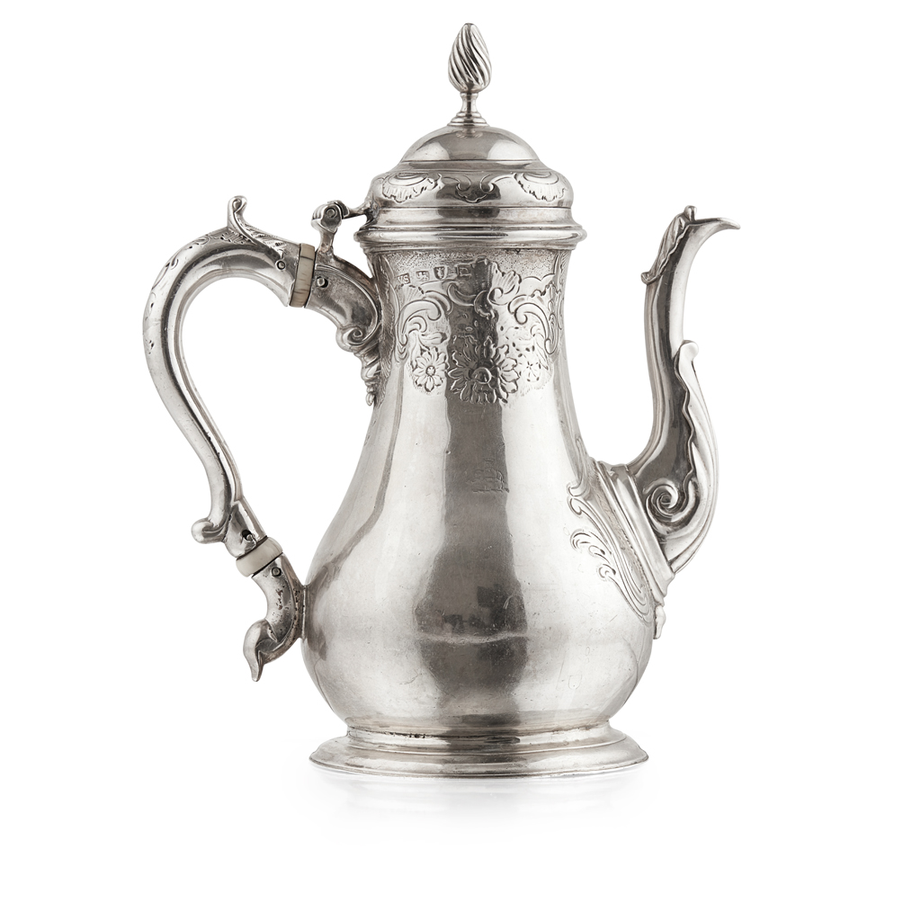 WS London, 1759, of baluster form, the hinged domed cover with wrythen knop finial, leaf and scroll clasped spout and handle, the body with engraved armorials, stepped circular base
