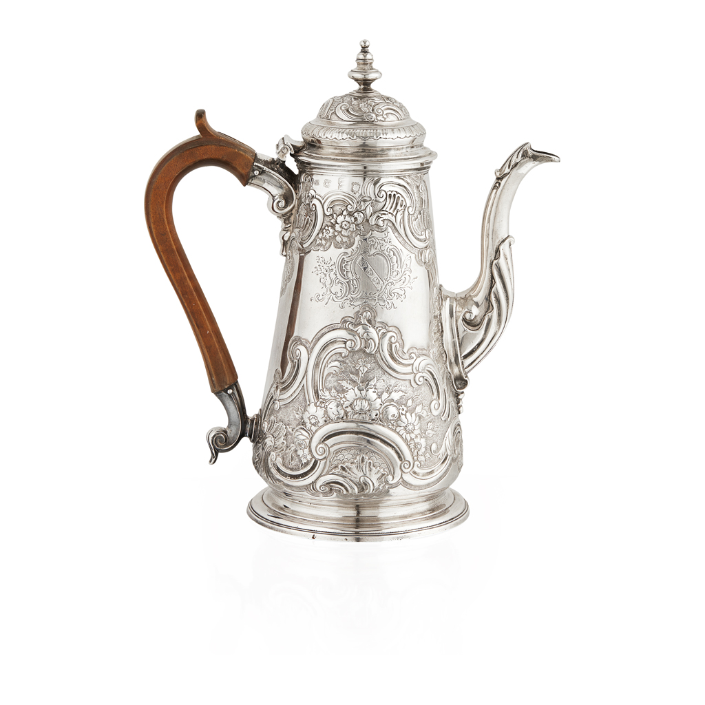 Possibly William Grundy, London 1747, of tapering form, allover chased scroll and foliate decoration, engraved armorials to each side, bold leaf clapsed scrolling spout, the hinged cover with turned finial, all on a spreading foot base