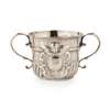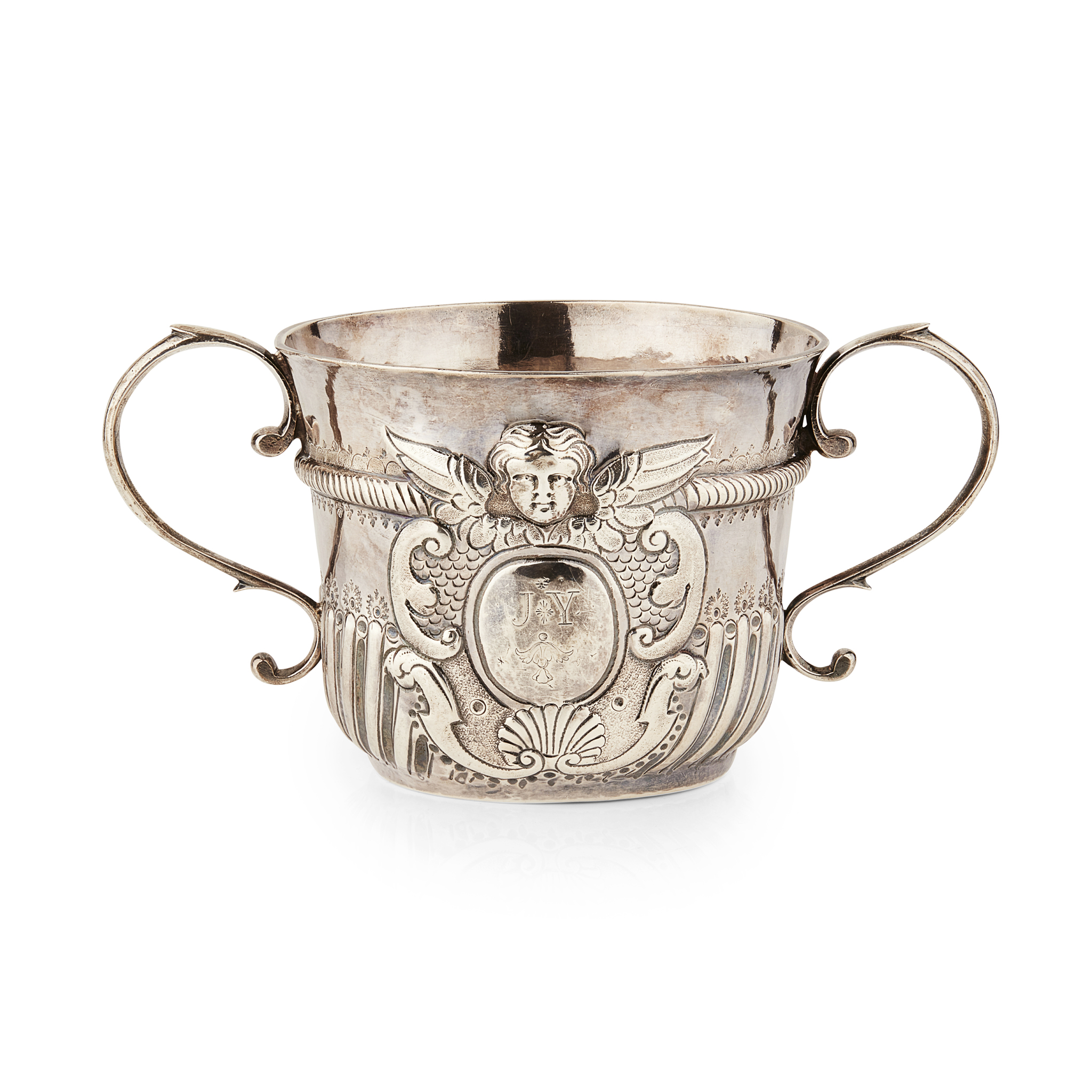 William Gamble, London 1707, the slightly bellied bowl with semi spiralled fluted lower section, cartouche with initials J*Y, the cartouche surrounded by scrolls, cross hatching with winged cherubs mask above, twin scroll handles