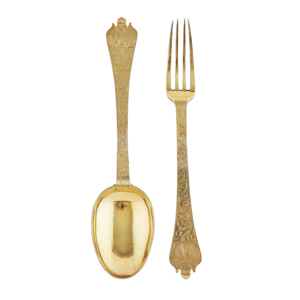 crowned head mark only, trefid terminal, all over scrolling engraved decoration, rat tail to bowl with leaf detail (2)