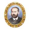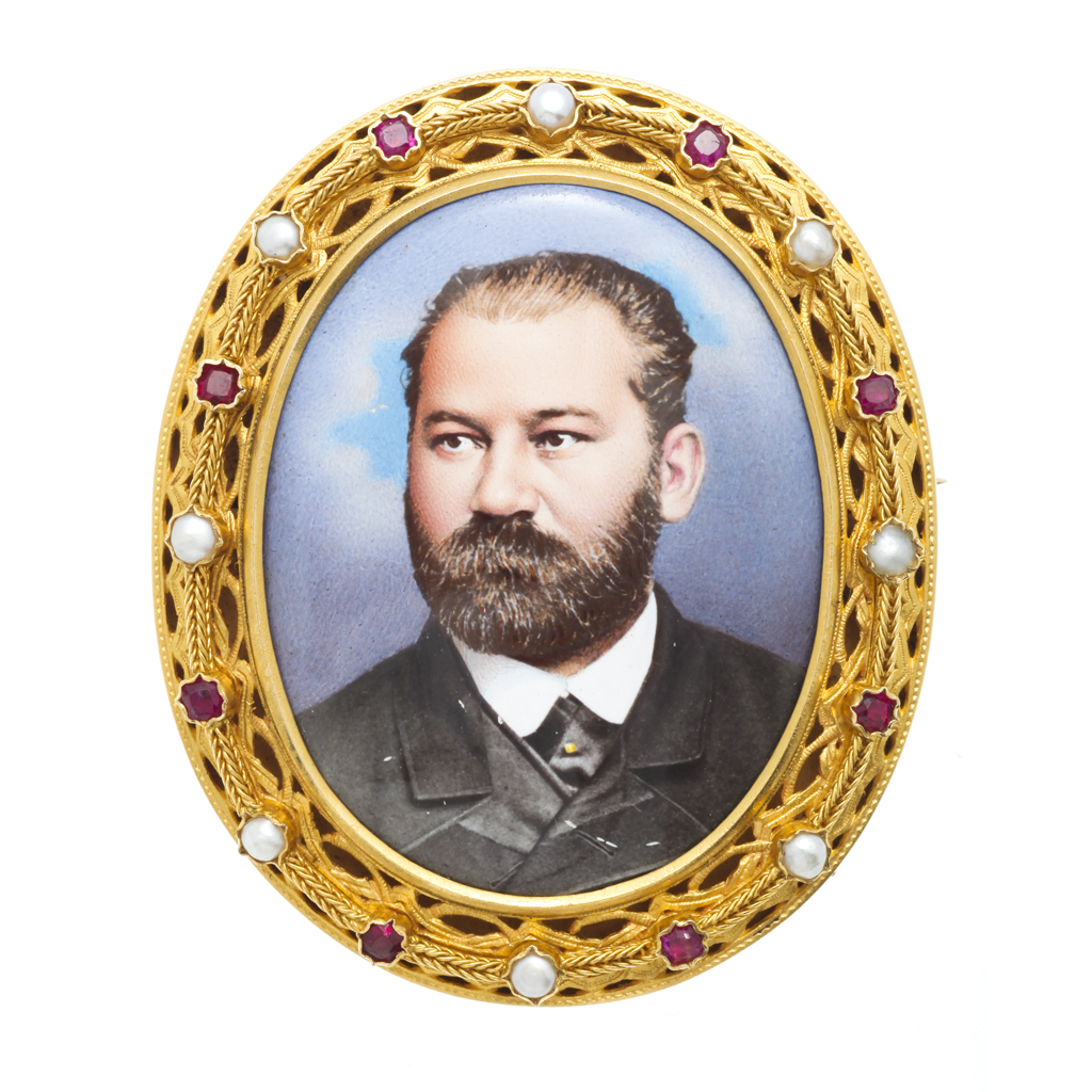 of oval outline, the central enamel miniature depicting a gentleman in a pierced woven border set with small seed pearls and rubies, with glazed panel and French control marks to reverse