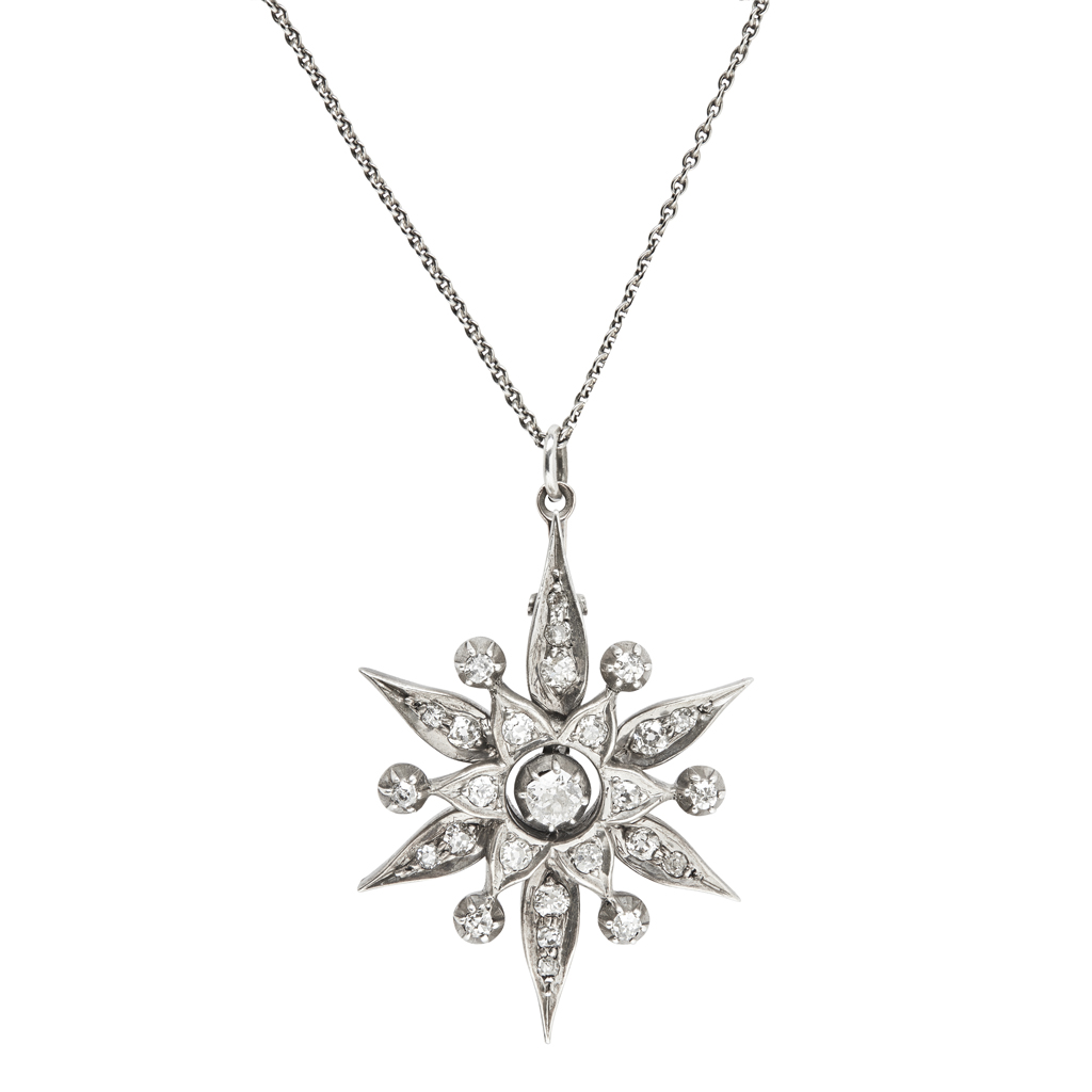 modelled as a twelve pointed star, set throughout with graduated round and eight cut diamonds, modelled in unmarked white metal, to a plain belcher link chain