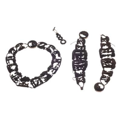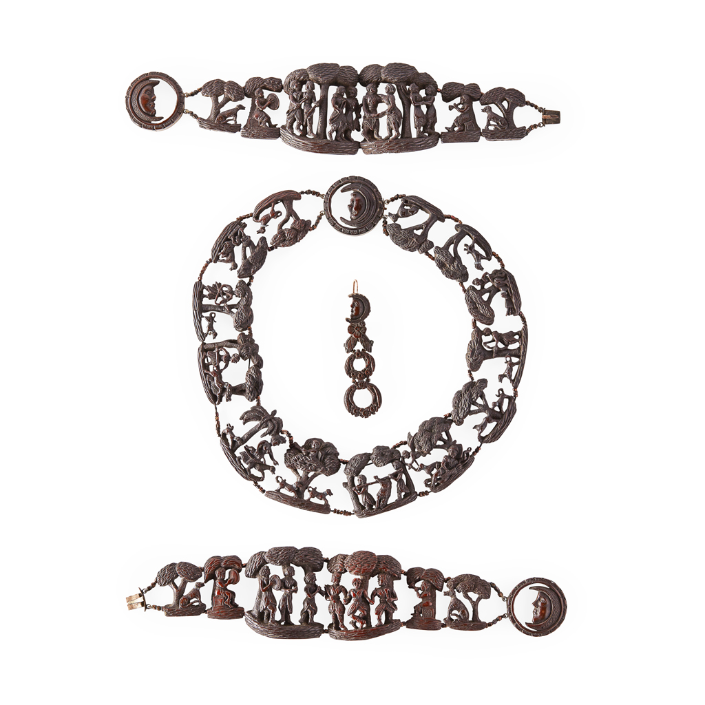comprising a pair of bracelets, a collar necklace and an earring, the panels depicting various figures, in country pursuits, dancing, dogs, crescent moon etc.