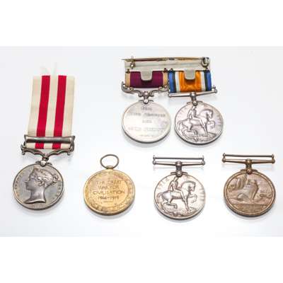 India 1857-58 medal to R Winning 79th Highlanders with Lucknow bar; A 1914-18 war medal to Sjt Gordon Winning, Gordons and long service good conduct medal to Sjt J Winning Seaforth Highlanders, both mounted on one bar; A.V.M., B.W.M., and Mercantile marine medal to George Winning M.F.A.