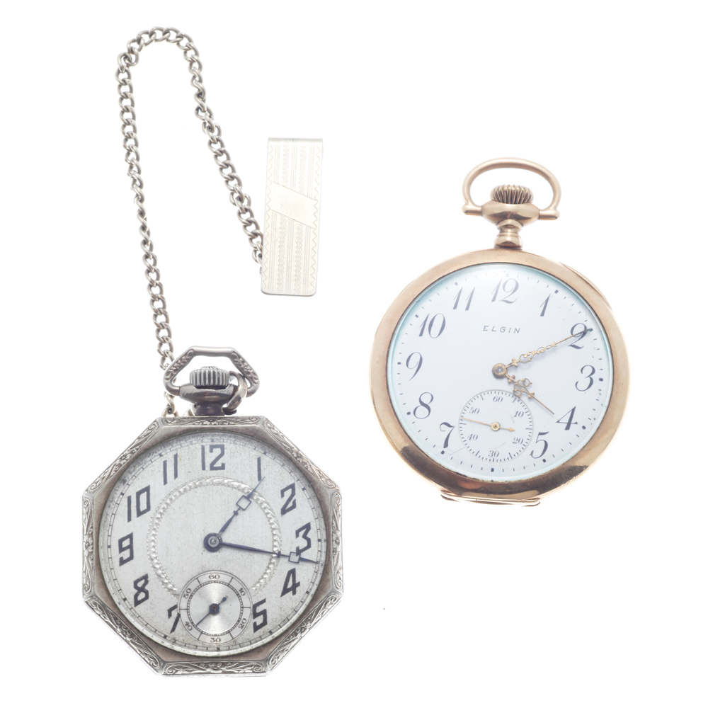marked 14K, open faced, engraved monogram and date to inner cuvette, white dial, Arabic numerals, gilt scrolling hands, subsidiary seconds dial; together with a white metal cased pocket watch, octagonal case, all over engraving and initials, lever movement, with a small Albert (2)