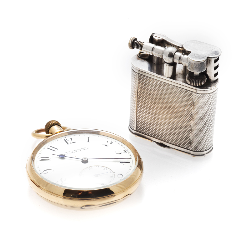 plain open faced watch, white enamel dial inscribed W E Harrison Stockton on Tees, subsidiary seconds dial, keyless wind lever movement, together with a DUNHILL lighter, engine turned case, patent no 288806 (2)