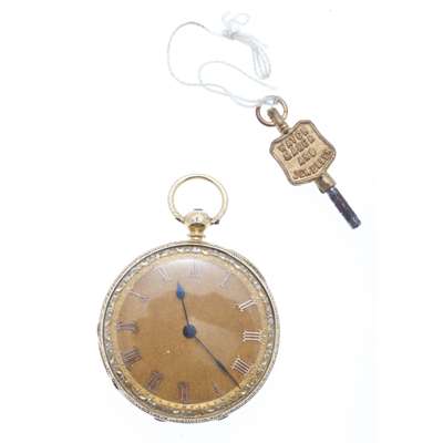 open faced key wind movement, gilt face and Roman numerals, the movement signed Brambles, Boar Lane Leeds, engraved cover