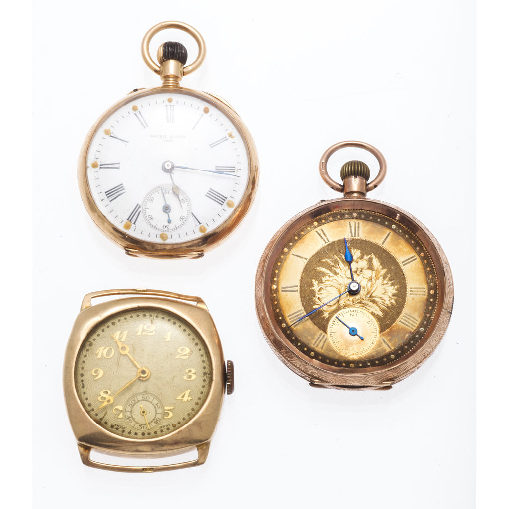 the open faced case with engraved monogram, white enamel dial with Roman numerals and inscribed Bruder Klumak Wien, keyless wind lever movement, together with; a Victorian 9ct gold cased open faced, keyless wind fob watch, engraved case, gilt dial; and a 1930s 9ct gold cased wrist watch head, plain Swiss lever movement, cushion shaped case, gilt Arabic numerals and hands (3)