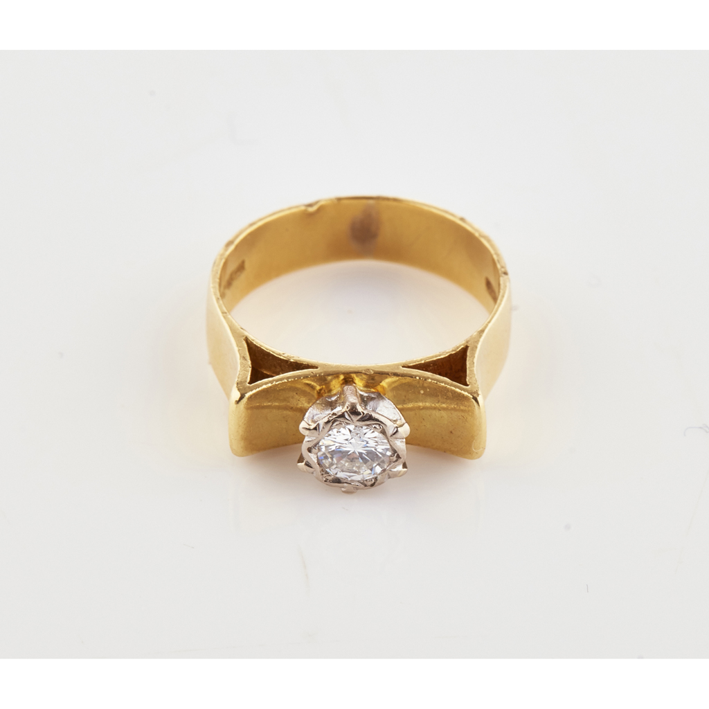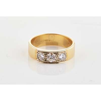 illusion set with a single round brilliant cut diamond, to a plain 18ct gold shank with raised shoulders; together with an 18ct gold three stone diamond ring (2)