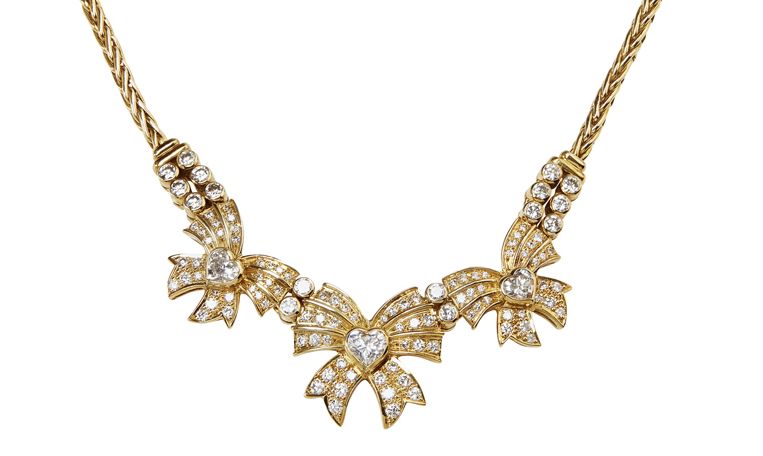 the central bow and heart motif set throughout with graduated small round cut diamonds, collet set with three central heart shaped diamonds, to an integral woven link chain with barrel clasp, modelled in unmarked yellow metal