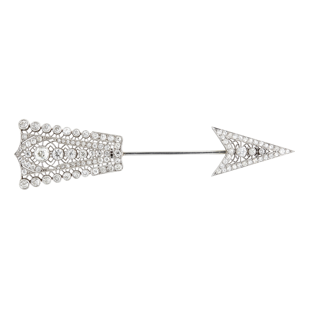 modelled as an arrow, set throughout in unmarked white metal with graduated old round cut and small eight cut diamonds, with pierced detail and detachable arrow head