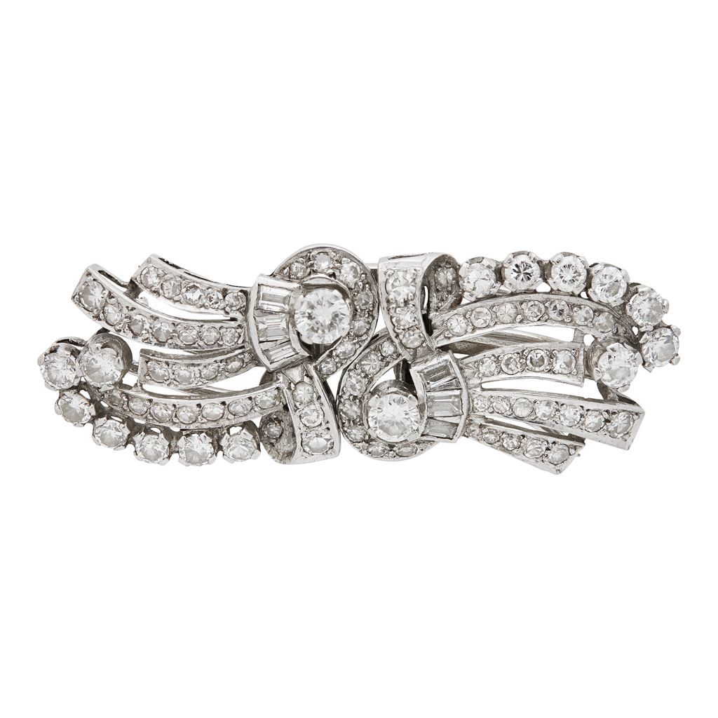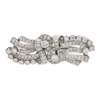 of scrolling design, set throughout with round brilliant, baguette and eight cut diamonds, set in unmarked white metal, with brooch fittings to reverse
