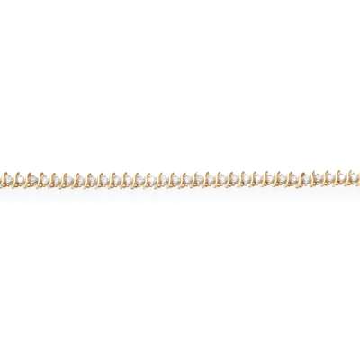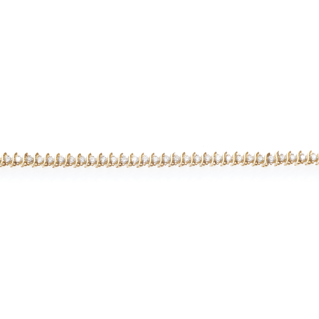claw set with a single row of small round cut diamonds, between S-scroll links, clasp stamped 14K