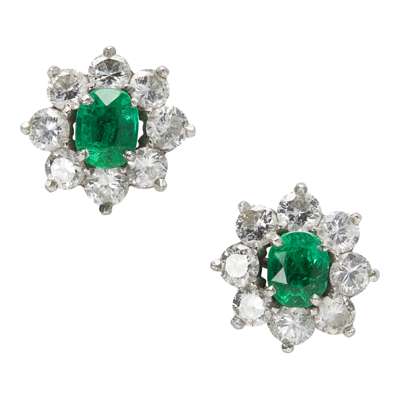 each claw set with an oval cut emerald in a single border of round cut diamonds, with post and butterfly fittings, unmarked