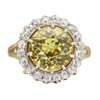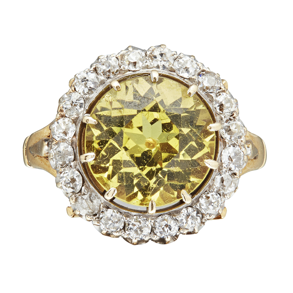 claw set with a circular cut yellow sapphire in a single border of old round cut diamonds, to a plain yellow metal shank stamped 18ct