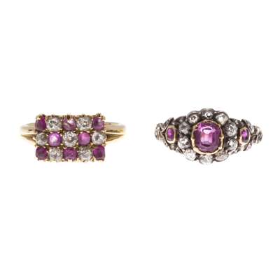 the first with a rectangular panel set with alternating small cushion cut rubies and diamonds, to a plain yellow metal shank stamped 18; together with a floral cluster ring set throughout with small round and rose cut diamonds, and three graduated oval cut rubies (2)