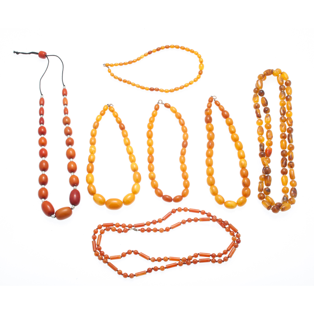 each composed of a double row of graduated amber beads, each with a bolt ring clasp; together with three further amber and imitation bead necklaces (5)