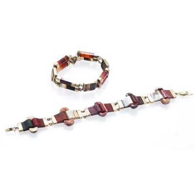 the first composed of cylindrical banded agate links and square hardstone set links, set in unmarked yellow metal; the other also set in unmarked yellow metal, the stylised links set with various hardstones (2)