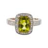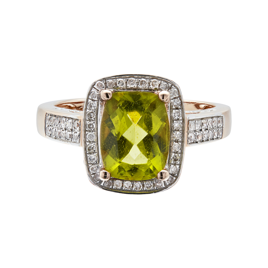 claw set with an oval mixed cut peridot in a single border of small round cut diamonds, the shoulders and gallery similarly set, to a plain band stamped 14K