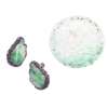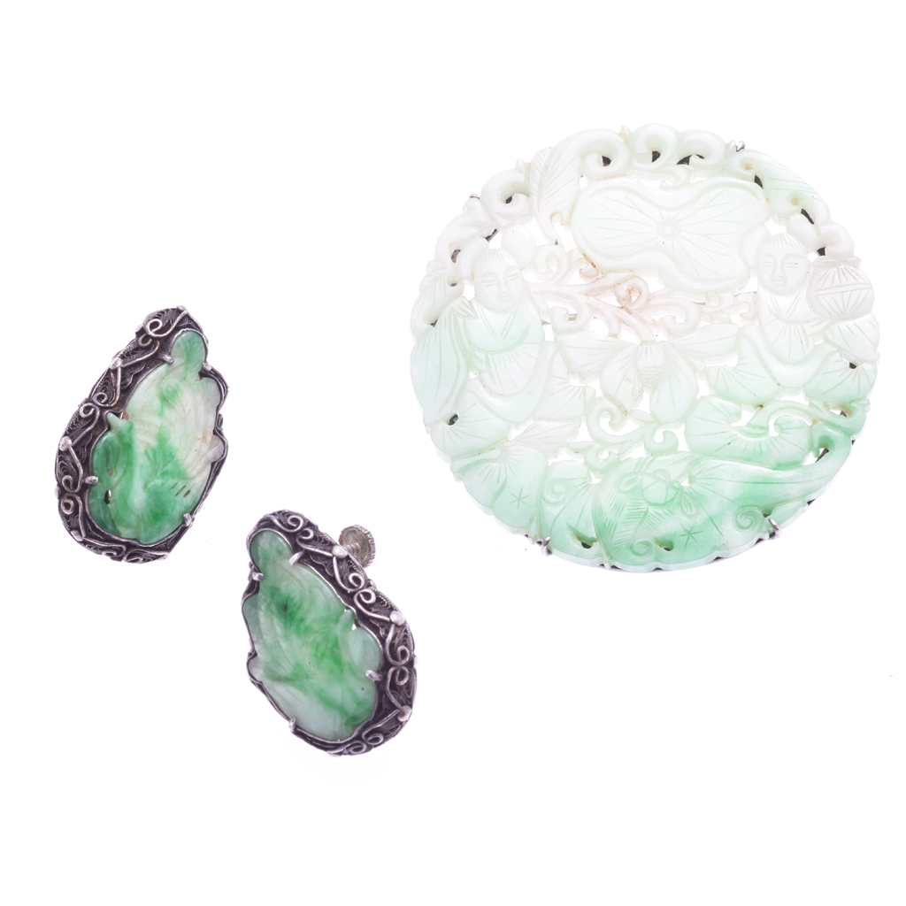the jade panel with carved details of Chinese figures and birds, in a plain silver mount; together with a pair of small silver mounted jade earrings, each carved as birds, the mounts with simple applied wirework to the conforming frame (2)
