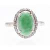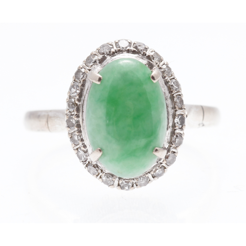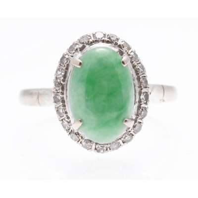 claw set with an oval jade cabochon in a single border of small round cut diamonds, to a plain white metal shank stamped 18
