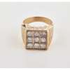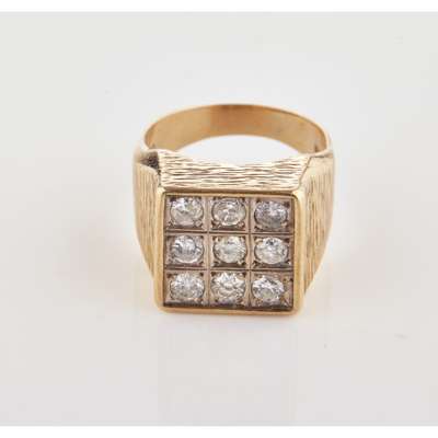 set with nine round cut diamonds, to a larger textured gold setting and a plain yellow metal shank