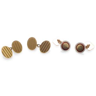 the oval terminals with simple engine turned detail, belcher links; together with another pair, the circular mother of pearl terminals with enamel detail, secondary square terminals with engine turned detail, stamped 15 (2)