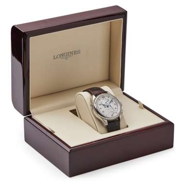automatic movement, Cal L2.715.4, visible back, engine turned dial, fly back seconds arc, day date arcs, Longines Master Collection Retrograde, serial no. 33797522, with presentation box
