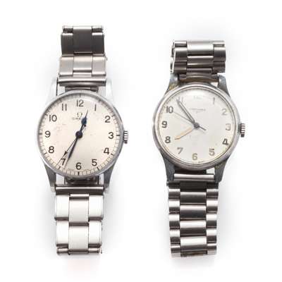 plain case, off white dial, Arabic numerals, sweep second hand, Omega bracelet and fold over clasp; together with a Longines gentleman's stainless steel wrist watch, plain case, off white dial, Arabic numerals, sweep second hand, luminous hands, snap off back engraved R.N.F.C. 2, later Omega stainless steel bracelet (2)