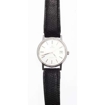 Genève model, plain case sweep second hand, silvered dial with date, leather strap, Omega buckle, movement probably 1030