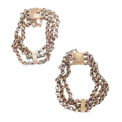 both composed of three strands of belcher links, with engraved box clasp and spacers (2)
