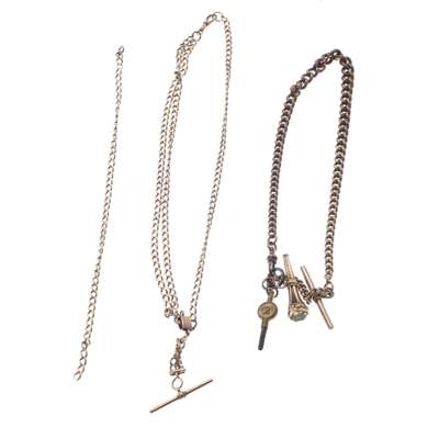 to include a rolled gold double Albert with a Victorian fancy watch key, gold sleeved; with a short yellow metal curb link piece of chain and a longer double section marked '9c' (3)