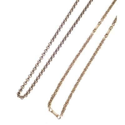 composed of circular belcher links, to a bolt ring clasp; together with another yellow metal fancy link chain with indistinct foreign marks (2)